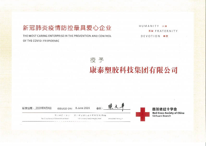 2020.11康泰集團(tuán)榮獲四川省“新冠肺炎疫情防控最具愛心企業(yè)”稱號近日,為表彰康泰塑膠科技集團(tuán)在新冠疫情防控工作中的突出貢獻(xiàn),四川省紅十字會授予集團(tuán)“新冠肺炎疫情防控最具愛心企業(yè)”榮譽(yù)稱號。2020年1月,正當(dāng)全國人民喜迎新春佳節(jié)時(shí),一場突如其來的新型冠狀病毒肺炎疫情肆虐中華大地。面對新型冠狀病...閱讀人數(shù):7694 -