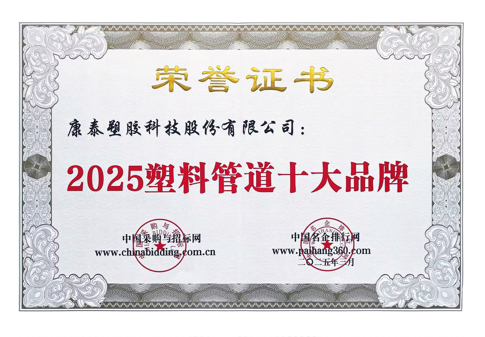康泰集團(tuán)榮獲“2025塑料管道十大品牌”、“2025家裝管道十大品牌”等稱號2025/03/24 3976日前,在中國采購與招標(biāo)網(wǎng)、中國名企排行網(wǎng)聯(lián)合主辦的中國塑料管道評價(jià)活動...read more -