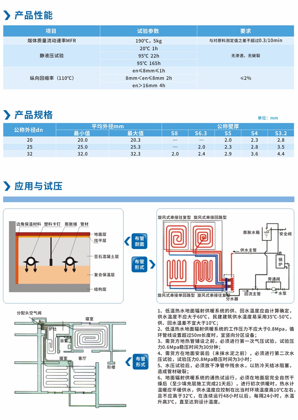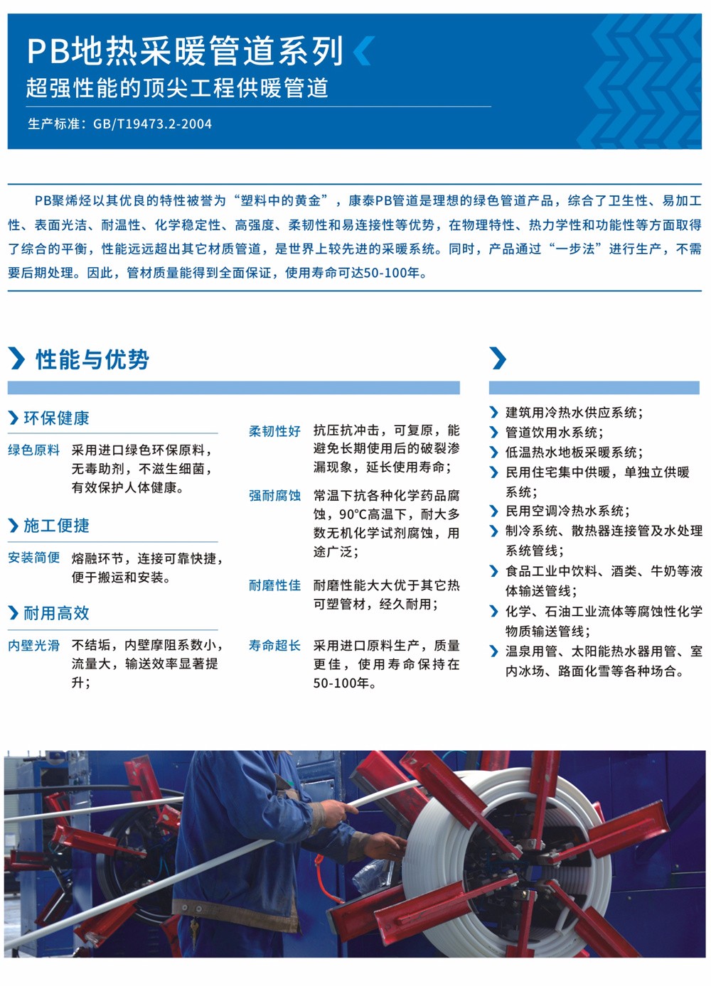從結(jié)構(gòu)上來看,聚丁烯(PB) 是一種線性的半結(jié)晶性熱塑性材料,是一種高分子惰性聚合物,是世界上最先進(jìn)的化學(xué)材料之一。加工和使用過程中無毒無污染,可以反復(fù)加熱成型。聚丁烯(PB)綜合了衛(wèi)生性、加工性、表面光潔度、耐溫性、化學(xué)穩(wěn)定性、強(qiáng)度、柔韌性和易連接性等優(yōu)勢(shì),在物理特性、熱力學(xué)特性和功能性等方面取得了綜合的平衡,從而賦予了PB地?zé)岵膳芄懿闹T多得天獨(dú)厚的特質(zhì),能夠用于流體輸送系統(tǒng),尤其在建筑內(nèi)的熱水輸送系統(tǒng)領(lǐng)域開辟了廣闊的用武之地,PB管道是世界上較先進(jìn)的采暖系統(tǒng),他的優(yōu)良特性被越來越多的人關(guān)注,被譽(yù)為“塑料中的黃金”。 聚丁烯(PB)管材是目前較理想的地板采暖管材和冷熱水管材,其性能遠(yuǎn)遠(yuǎn)超出其它管材的,我公司生產(chǎn)的新型PB地板采暖管,采用PB專用料生產(chǎn),因此材質(zhì)是十分可靠的。PB管道的生產(chǎn),實(shí)現(xiàn)了真正的“一步法”,它不需要后期處理,因此,管材質(zhì)量能得到全面保證,使用壽命可達(dá)50年-100年。